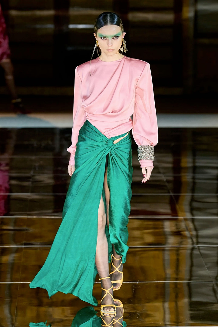 In his Fall-Winter 2023-2024 collection, Prabal Gurung suggests wearing a draped skirt with a slit in a deep emerald green. This can be paired with a sweatshirt in a delicate pastel pink hue and sandals in a vanilla yellow tone. The contrast between these shades creates a bold and captivating look, highlighting how color blocking can play with a diverse range of colors.