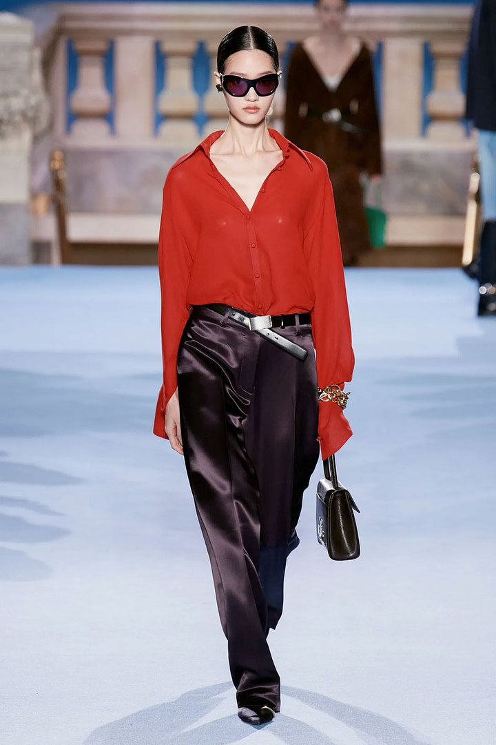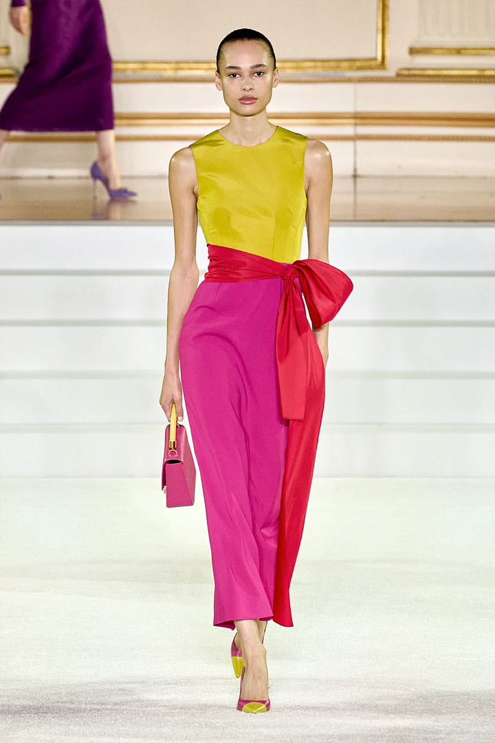 Carolina Herrera has successfully captured the essence of color blocking with bold pairings. In her autumn-winter 2023-2024 collection, the designer has demonstrated how fascinating it can be to blend vibrant colors for stunning looks. For instance, she has created a dynamic contrast by pairing strawberry-colored pants with a bright lime top. The addition of a belt with a maxi red bow not only defines the silhouette but also adds a touch of originality.