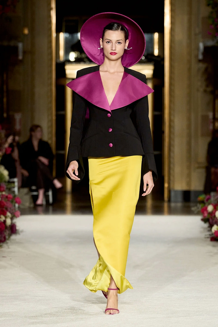 On the other hand, Christian Siriano plays with an extraordinary chromatic combination: a yellow skirt paired with a black jacket featuring fuchsia collar and buttons, complemented by a hat in the same vibrant tone. This pairing of lively and contrasting colors creates a bold and playful look, distinguished by its originality.