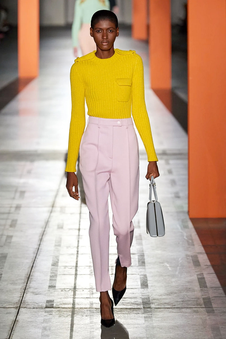 In Prada’s autumn-winter 2023-2024 collection, they also present the combination of confetti pink trousers and canary yellow cardigan for a lively and personality-filled look. Prada’s confetti pink trousers are a delicate yet bold choice. This slightly dusty shade of pink adds a touch of femininity and sophistication to the overall look. On the other hand, the canary yellow cardigan captures attention with its brightness and brings a burst of energy and cheerfulness to the look. Pairing these two contrasting colors creates a bold and surprising color mix.
