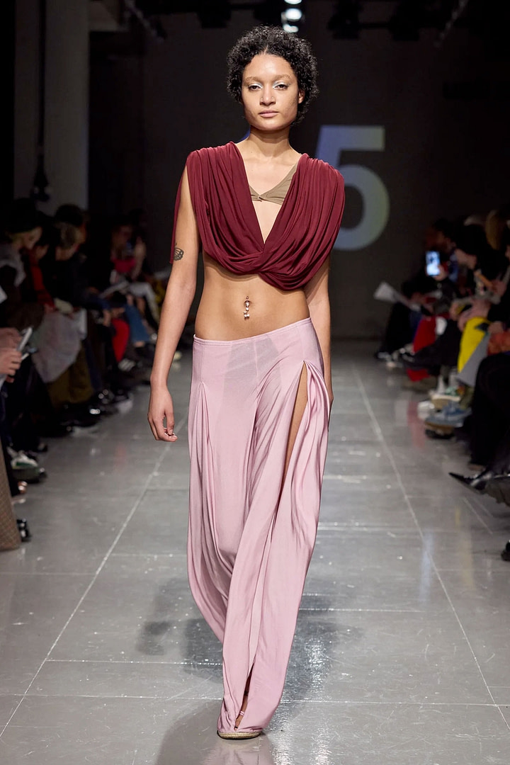 Central Saint Martins also demonstrates great mastery in the use of color blocking. With an ensemble featuring pink trousers and a Bordeaux top, it successfully embodies sophistication and modernity. The pastel pink of the trousers, delicate and feminine, pairs beautifully with the rich Bordeaux of the top, adding depth and intensity to the entire outfit.