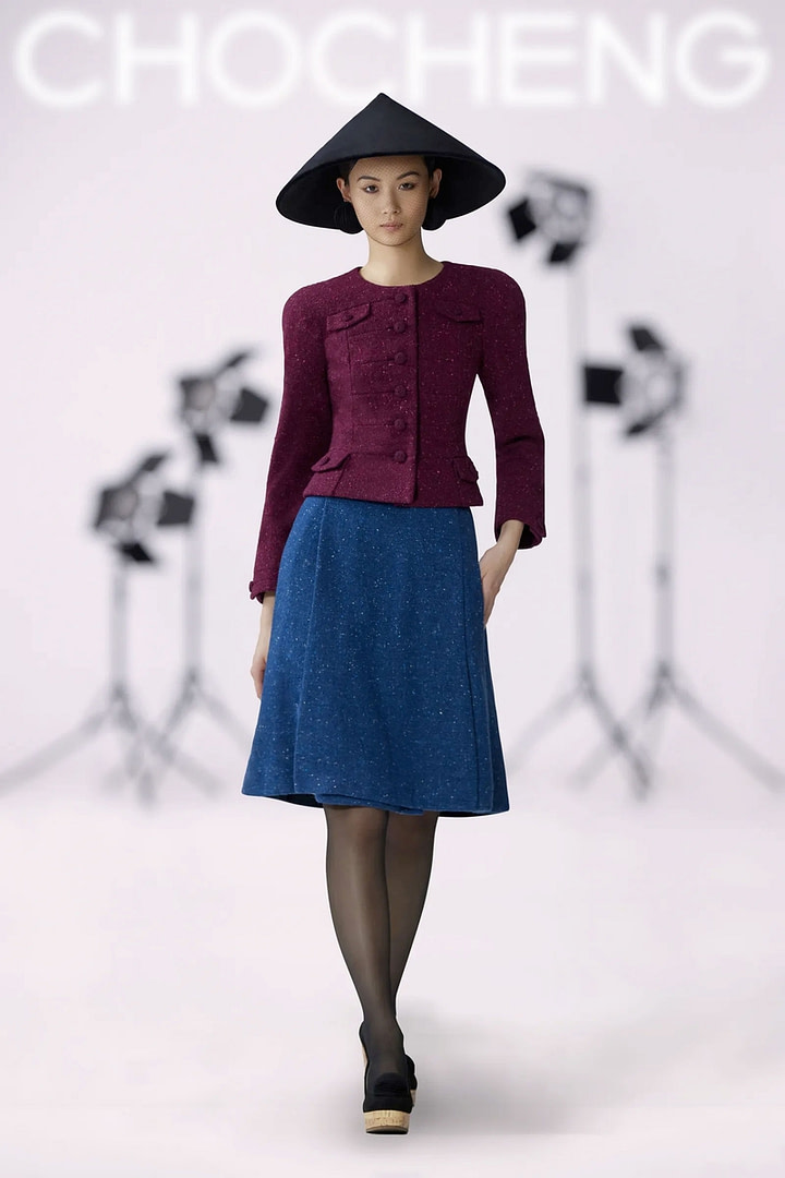 ChoCheng also brings his unique touch to the art of color blocking, skillfully balancing opposing shades. In his autumn-winter 2023-2024 collection, he pairs a Bordeaux jacket with an above-the-knee blue skirt. This color combination creates a pleasing and captivating effect.