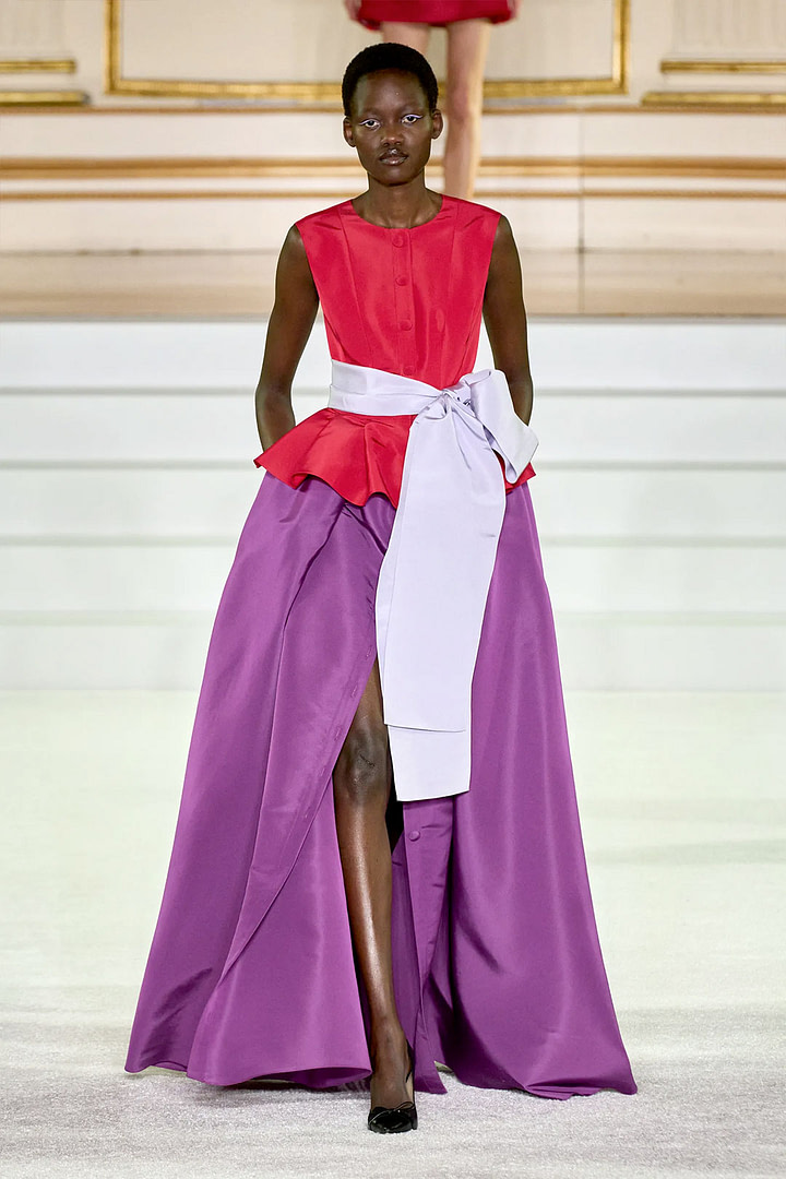 Another example of a color combination presented by Carolina Herrera is a bold dress that pairs a vibrant red top with a wide purple skirt featuring a front slit. This lively contrast between the two shades creates a captivating visual effect. The strategic choice of a pearl gray belt elegantly blends the different color nuances, adding further sophistication to the outfit.