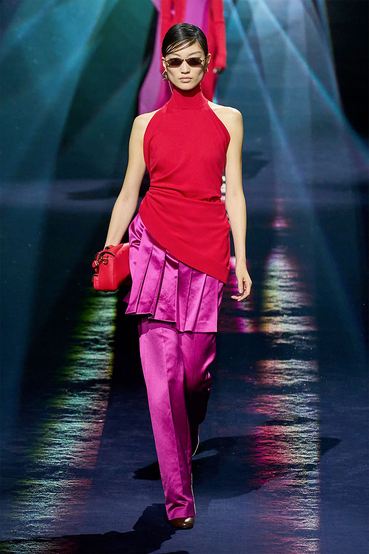 Fendi pushes the boundaries, daring with combinations of complementary colors such as fuchsia and red, to create cutting-edge and visually striking looks. This chromatic choice highlights both shades, generating a captivating contrast.