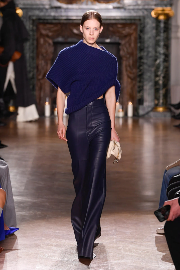 Bottega Veneta made a distinctive mark with garments featuring structured shoulders and leather creations displaying a rich shade of bitter cocoa, a chromatic choice that enhances the brand’s image of reserved luxury and sophistication.
