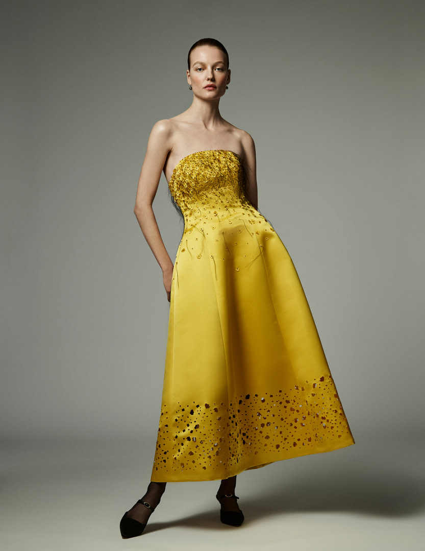 Several designers have incorporated Misted Yellow into their collections for this season, showcasing its versatility and delicate charm. Among them, Kiko Kostadinov, Jonathan Cohen, Shuting Qiu, Shiatzy Chen, and Luisa Spagnoli have adeptly used this shade to create unique and captivating pieces.