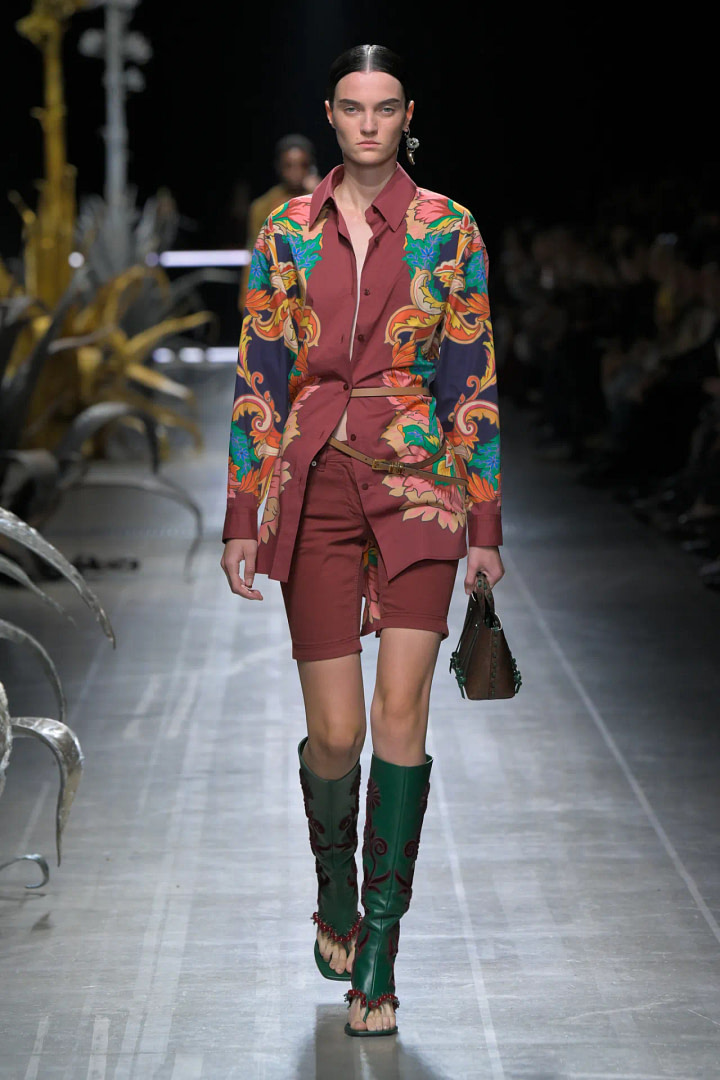 Alongside this vibrant hue, Camellia added a more romantic and refined dimension. Etro used Camellia for flowing chiffon dresses embellished with ethnic and floral patterns, creating a sophisticated bohemian look. Stella McCartney, on the other hand, chose Camellia for midi dresses with soft lines, featuring transparencies and overlays that convey a delicate balance between dynamism and femininity.