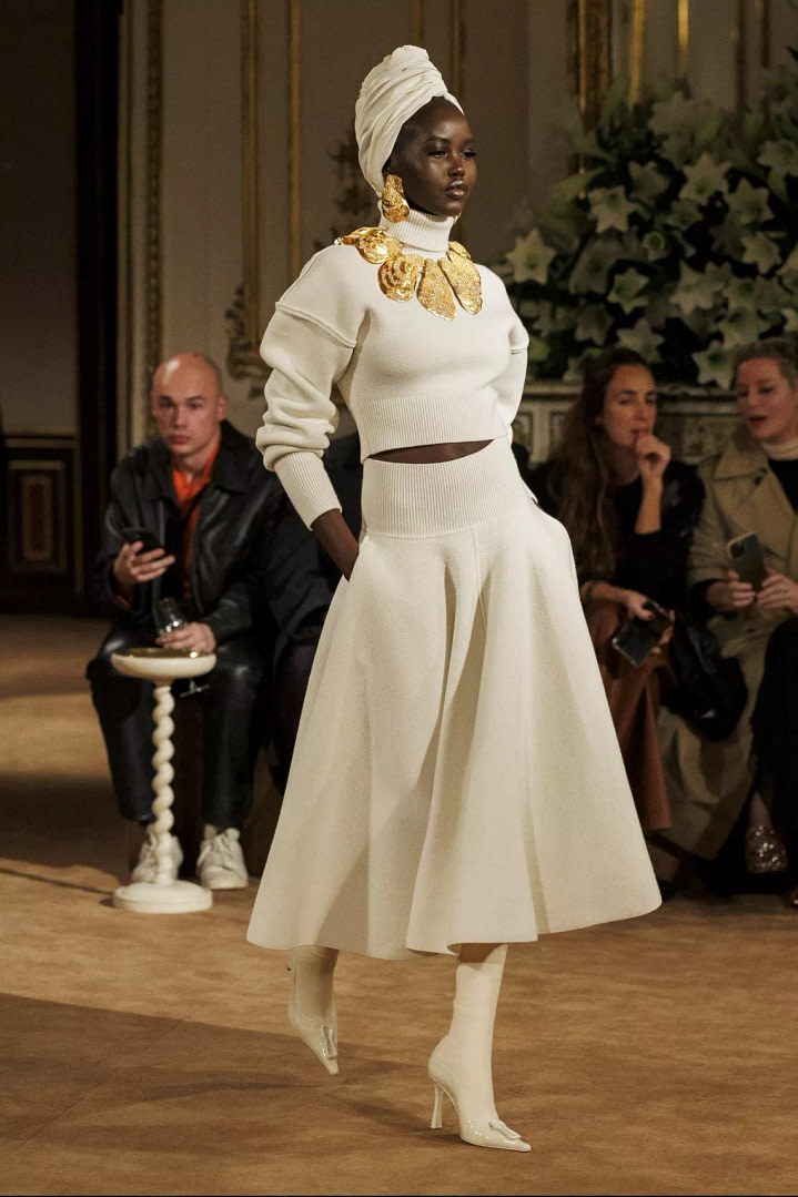 The ANTEPRIMA Fall Winter 2023-2024 collection exudes elegance and refinement, with a range of full skirts in black, beige, and patterned designs. Schiaparelli opted for a full white skirt, pairing it with a white turtleneck sweater, white boots, gold jewelry, and a white turban for a stunning monochromatic look. Dior presented a beautiful floral circle skirt, perfect when paired with an elegant plaid overcoat, for a refined and trendy outfit.