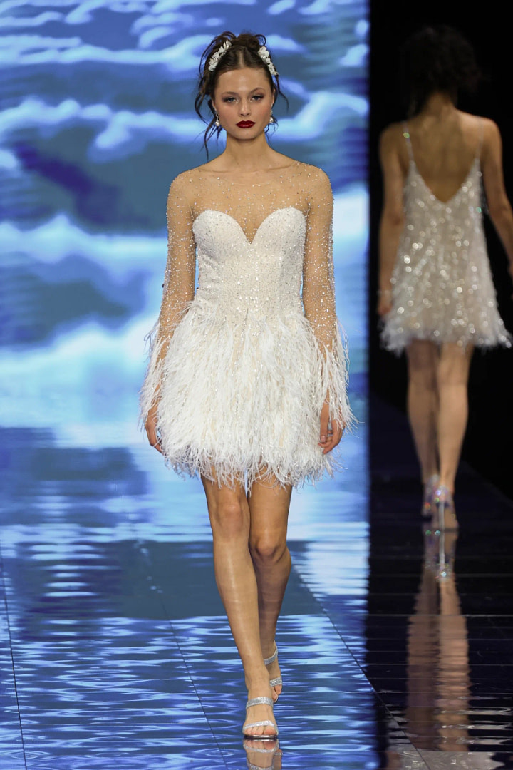 Young and bold brides are destined to find inspiration in short wedding dresses. These “party dresses” represent one of the most surprising and contemporary trends of 2024. Their modern and sensual aesthetic embodies a joyful spirit that’s perfect for those who want a wedding that breaks the mold.