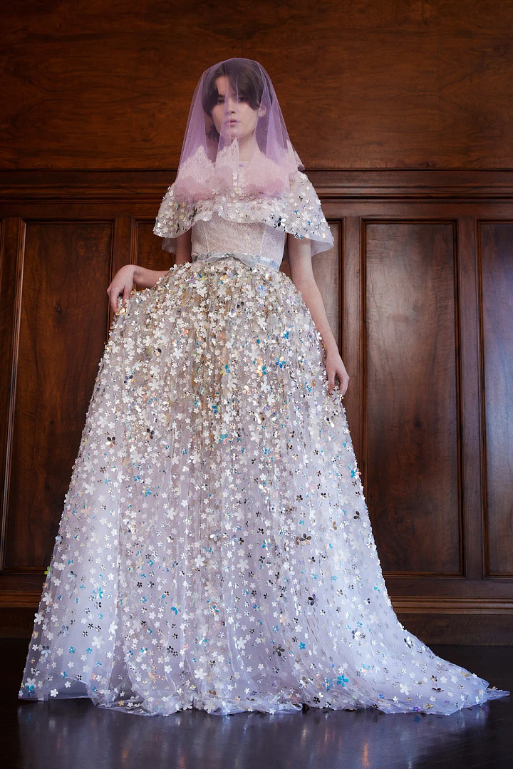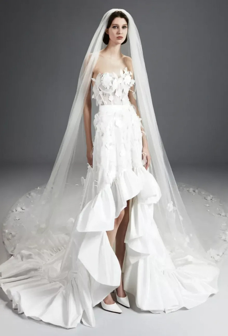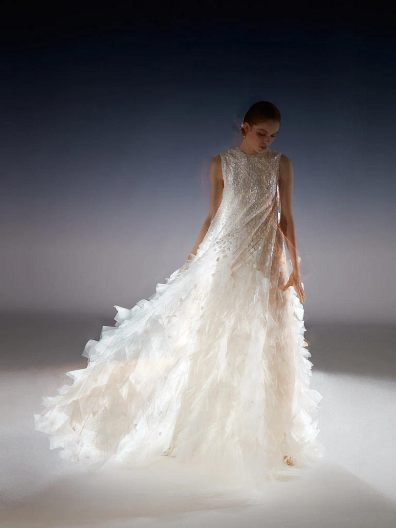 For spring 2024, the chosen fabrics for wedding dresses reflect a captivating blend of tradition and innovation. In addition to classic wedding fabrics like cady and taffeta, which continue to be charming choices for creating elegant and structured dresses, fabrics like organza and mikado also take the spotlight. These fabrics are known for their sheen and lightweight nature, adding a touch of elegance and movement to wedding dresses.