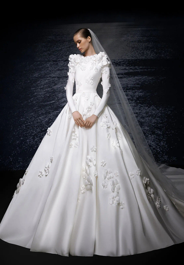 Flowers gracefully and elegantly adorn bodices, skirts, veils, and mantles, creating an extraordinary visual effect that captures attention and adds a touch of natural elegance to the wedding dress. These floral elements are ideal for brides who desire a unique and refined look that sets them apart from the crowd.