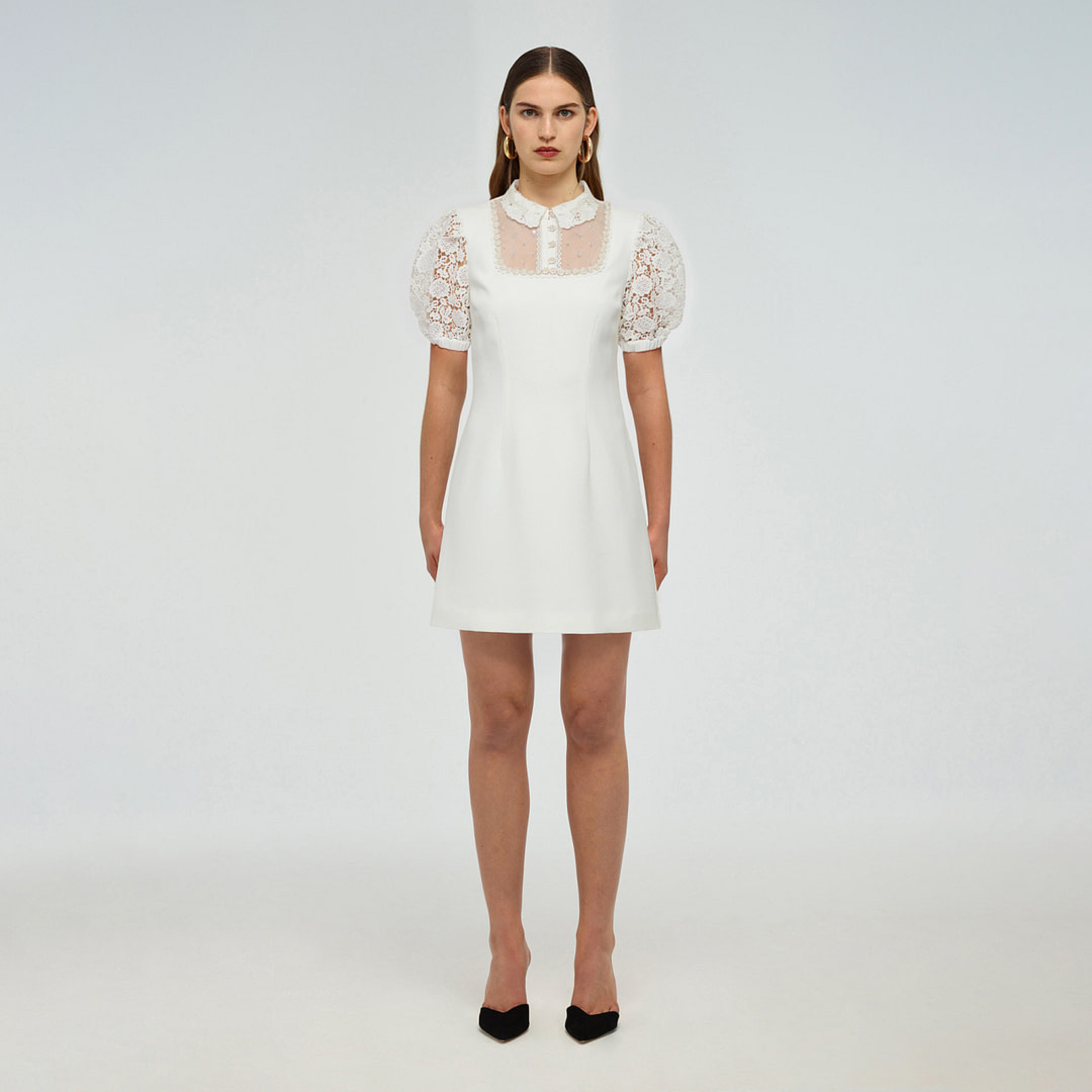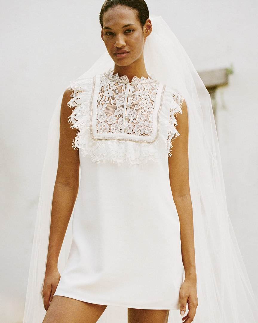 Self-Portrait a présenté une mini robe avec un col mandarin. Le décolleté et la dentelle florale sont le point central de l’ensemble du look de mariage.