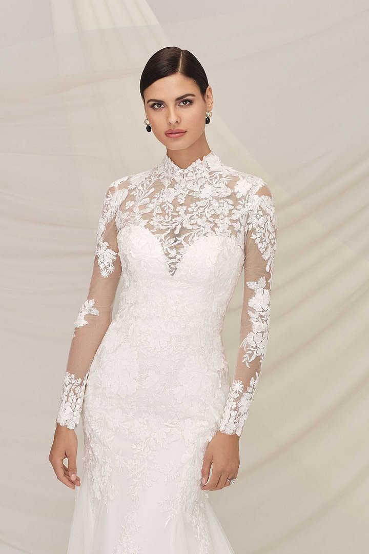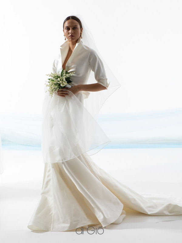 Dans la collection nuptiale printemps-été 2022 de Justine Alexander Signature, nous avons vu plusieurs robes de mariée avec un décolleté plongeant. En particulier, il y avait une robe ajustée avec un décolleté en cœur et une robe en crêpe sans bretelles, toutes deux avec une veste mandarine en dentelle.