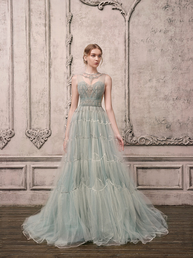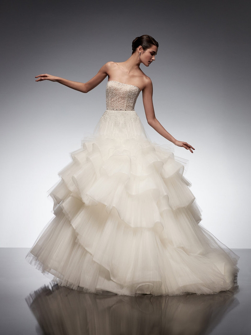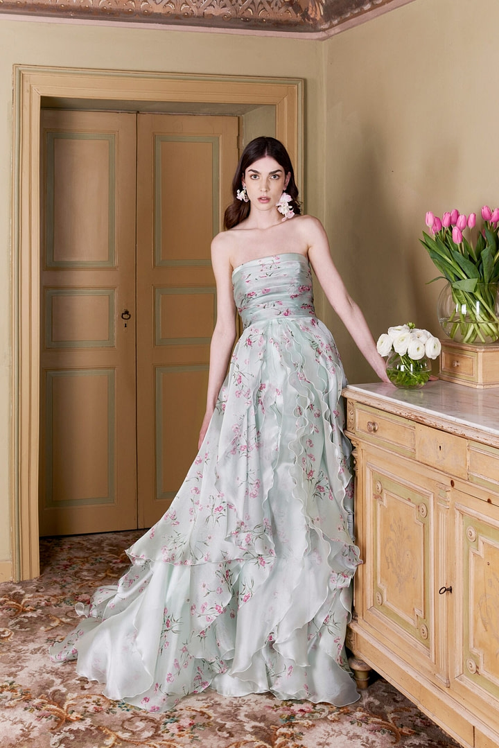 Alyne di Rita Vinieris a présenté une collection de robes de mariée printemps-été 2022 dans laquelle « la nature rencontre le romantisme » : des tulles diaphanes à la dentelle florale dimensionnelle et au crêpe durable, les détails sont délicats et fluides, permettant aux tissus de se draper délicatement sur la silhouette.