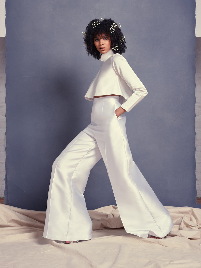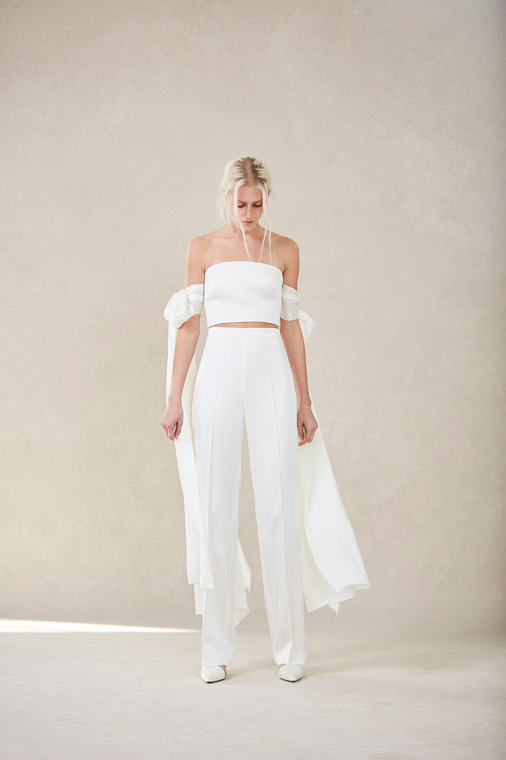 Nordeen a présenté une tenue de mariée minimaliste avec un pantalon et un haut. Le détail chic ? Une élégante étole qui entoure les bras, encadrant parfaitement la tenue.