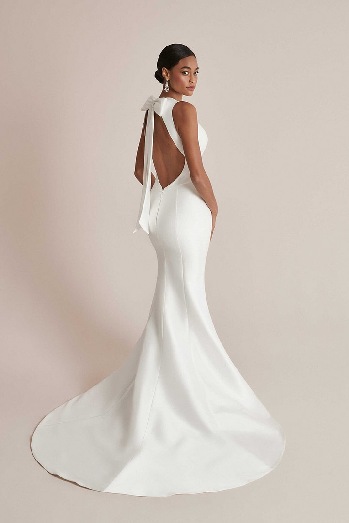 Pour le printemps-été 2022, Justin Alexander a conçu une robe de mariée simple, ajustée et évasée en mikado stretch avec un nœud amovible.