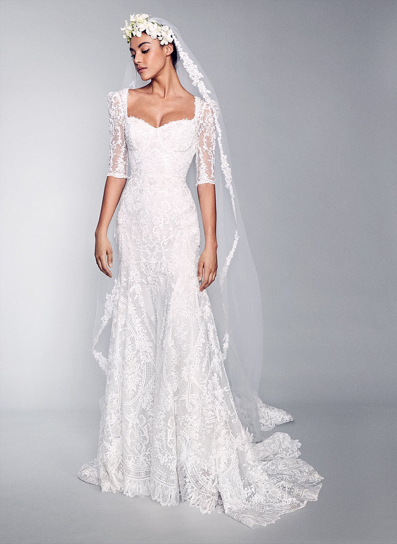 Marchesa a utilisé des inserts et des imprimés floraux sur les robes de mariée redingote, princesse et sirène. Inévitablement, des couronnes de fleurs étaient placées sur la tête pour donner à la mariée une allure romantique et féerique.