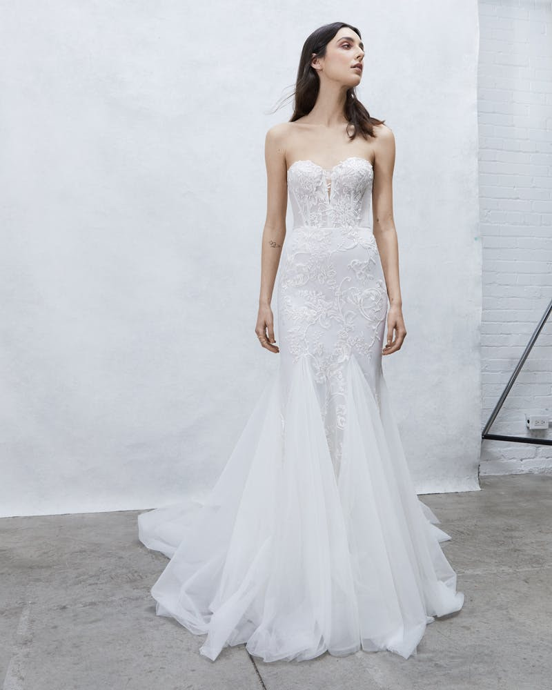 Carolina Herrera a présenté une robe de mariée bustier à trompette avec un corsage en dentelle florale française et une jupe en mikado de soie.