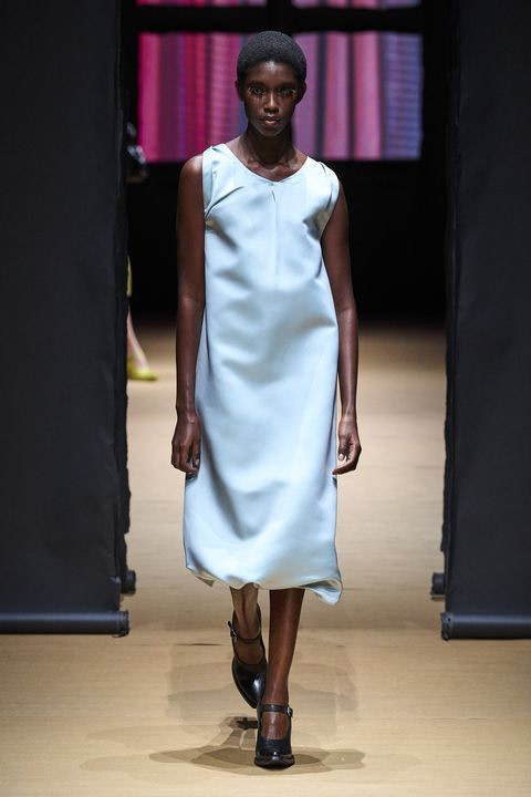 Prada pour le printemps-été 2023 propose une robe en satin bleu clair. Grâce à sa longueur sous le genou, la robe est parfaite pour une occasion formelle et une soirée élégante. La couleur bleu clair du tissu confère également à la robe une allure délicate et romantique, idéale pour un événement spécial.