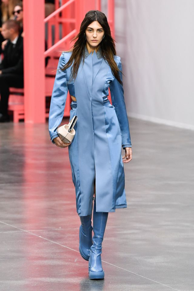 Fendi choisit le satin pour un manteau bleu ciel qui descend jusqu’à la cheville. Le satin donne au pardessus un aspect brillant et, grâce à sa souplesse, il s’adapte parfaitement à la forme du corps, créant une image sinueuse et féminine.
