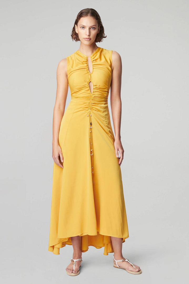 Parmi les collections printemps-été 2023 figure la robe » Kaya » d’Altuzarra, confectionnée en satin-crêpe dans une teinte joyeuse » Butterscotch « . Son corsage ajusté et ruché présente des découpes subtiles qui sont enfilées par des liens ornés de cordons de serrage.