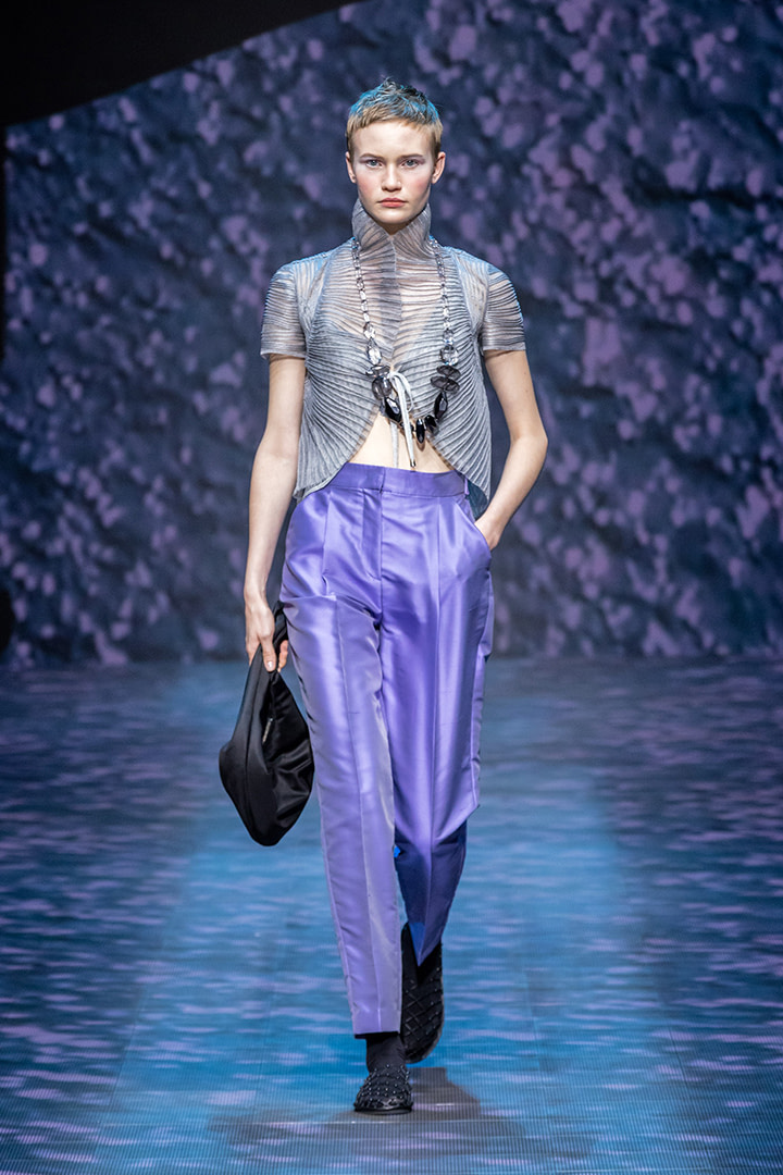 Emporio Armani choisit le satin pour confectionner d’élégants pantalons violets : ce tissu fluide qui épouse les formes du corps crée des plis naturels qui dynamisent le vêtement.