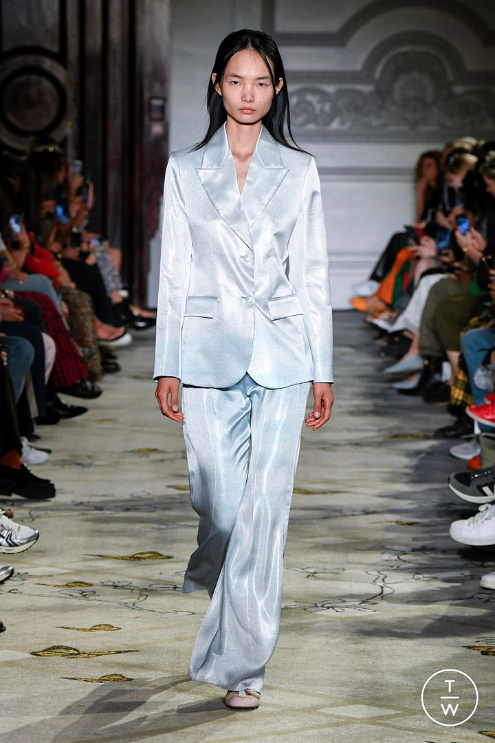 La marque française Paul & Joe choisit également le satin pour sa veste et son pantalon bleu ciel. L’allure est très raffinée et la coupe souple.