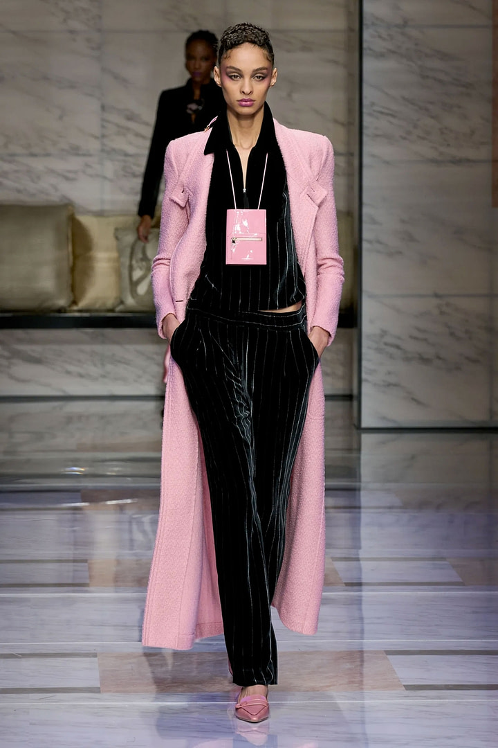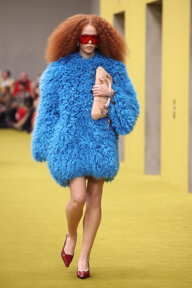 Bally ha presentato nella collezione autunno-inverno 2023/2024 soprabiti caratterizzati da tinte di viva magenta, come il trench in vinile stretto in vita da una tripla cintura e il cappotto furry indossato con sandali in vernice, creando look audaci e sofisticati.
