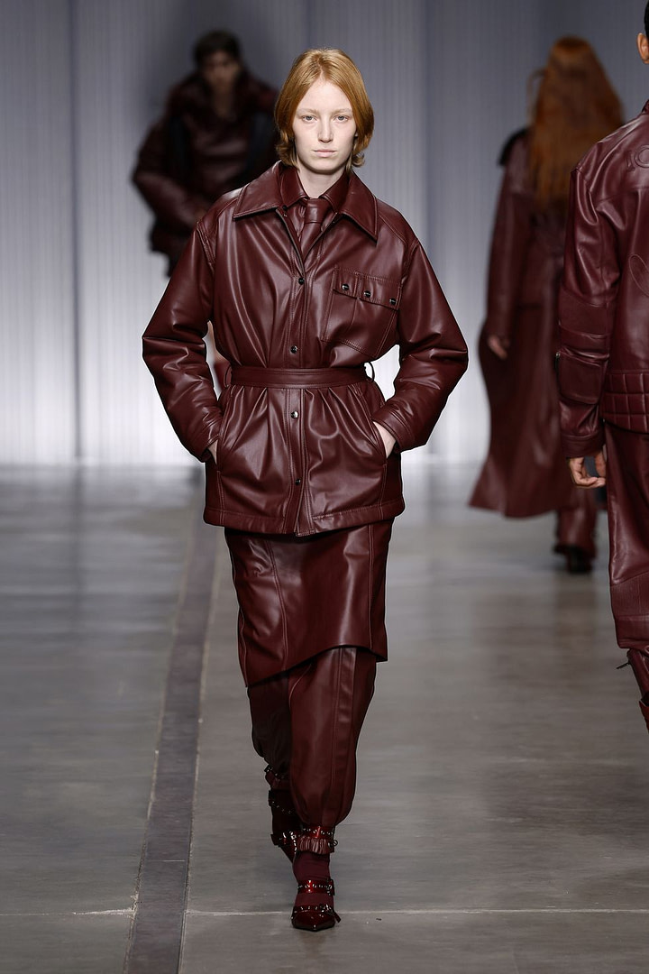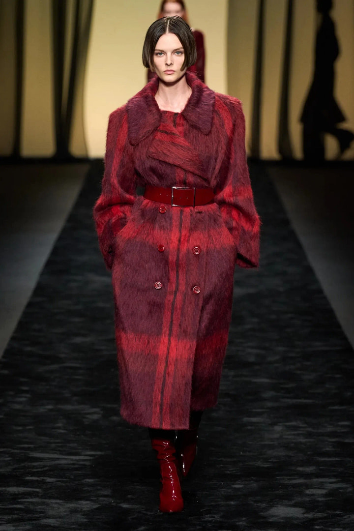 Ermanno Scervino ci sorprende con una serie di cappotti dal design innovativo e sofisticato: il trench coat rosso scuro in pelle morbida, coordinato con gli stivali cuissardes, e lo shearling sempre rosso scuro indossato con la lingerie tono su tono, creano look audaci e sensuali, che catturano l’attenzione e trasmettono una forte personalità.