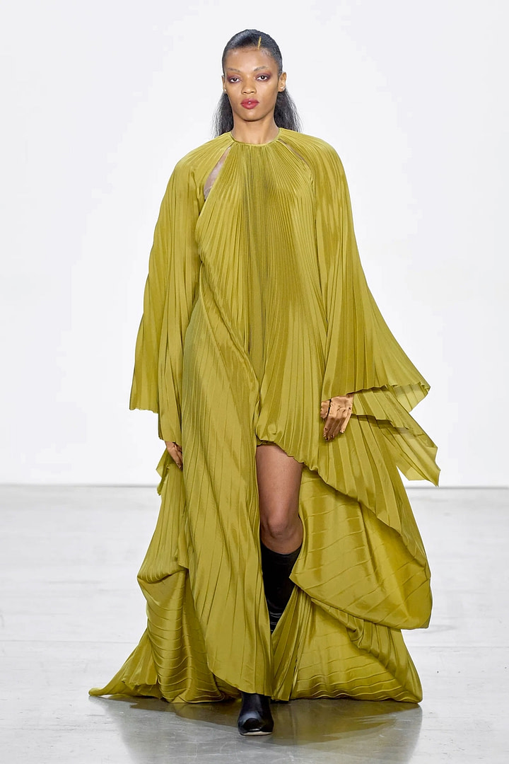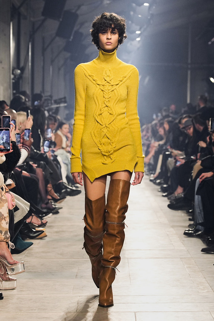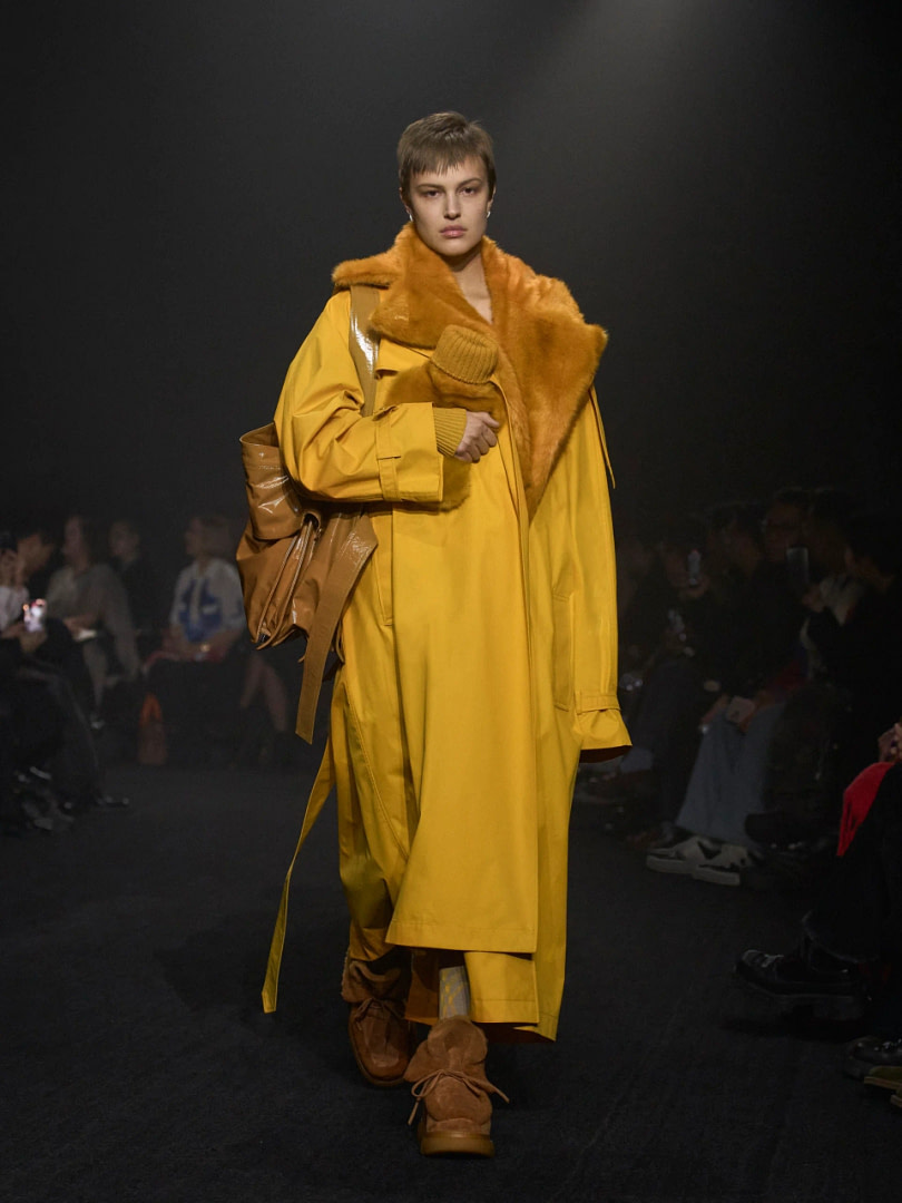 Marni è uno dei brand che conferma il trend del colore giallo per l’Autunno Inverno 2023/2024, recuperando stampe d’archivio e tingendole in tonalità che vanno dal senape al canarino, creando outfit dallo stile unico e originale. Altuzarra, invece, propone abiti dal design innovativo, come l’abito da sera con mini bomber di raso in coordinato e il vestito lungo con disegni botanici a contrasto.
