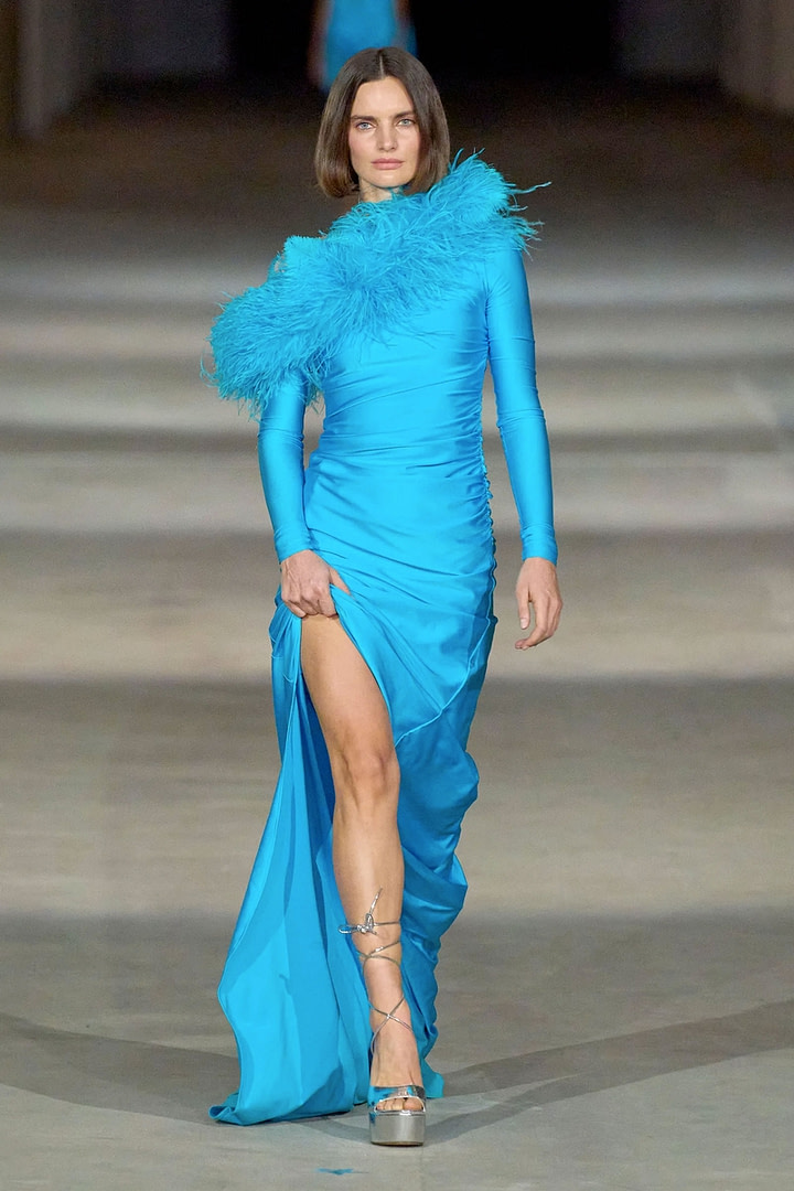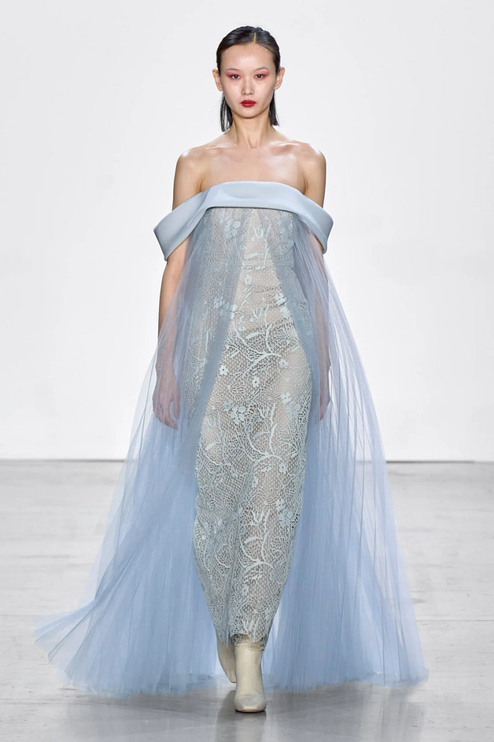 Etro usa la sfumatura Lacecap Hydrangea per abiti, mantelle e cappotti; Fendi ha inserito il colore Pantone su giacche, top, abiti e accessori; Bibhu Mohapatra ha creato un abito lungo in taffetà seta color blu floreale.