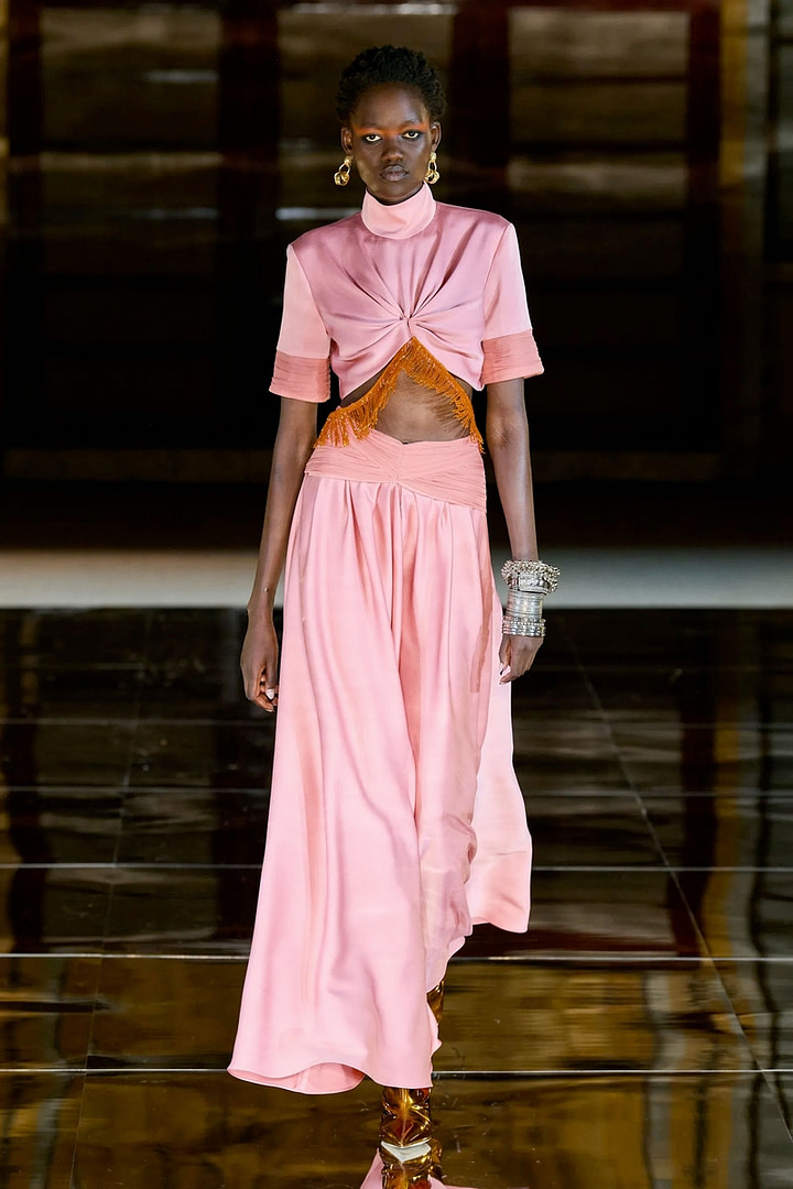 Il fiery red si rivela particolarmente seducente e sensuale, conferendo un’energia travolgente agli outfit. Ferragamo, ad esempio, ha proposto pellicciotti e completi sartoriali dal forte impatto visivo. David Koma, invece, ha scelto di esaltare la sensualità del rosso fuoco, utilizzando il fiore Anthurium per decorare mini abiti, top e guanti.